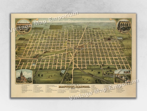 Vintage City Maps Bird’s eye view map of Mattoon, Illinois, 1884